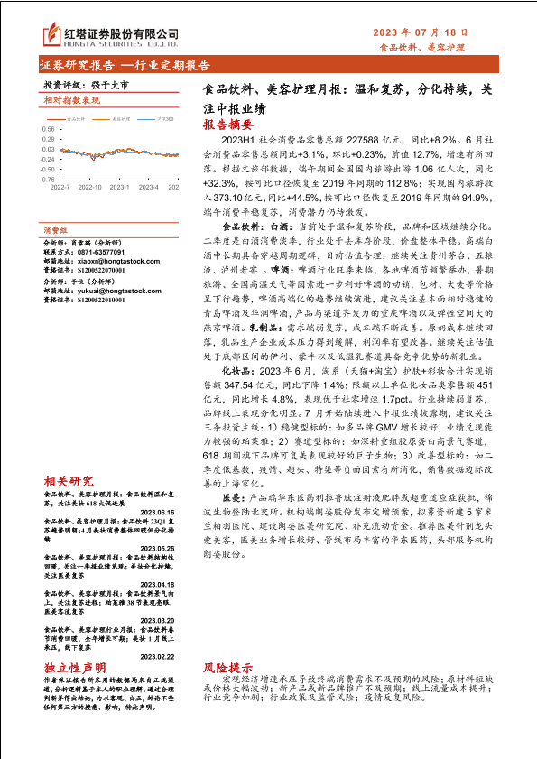 【红塔证券】【20230718】食品饮料、美容护理行业月报:温和复苏,分化持续,关注中报业绩-17页