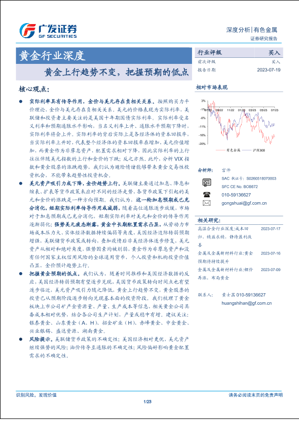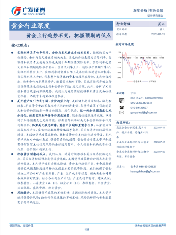 【广发证券】【20230719】黄金行业深度:黄金上行趋势不变,把握预期的低点-23页