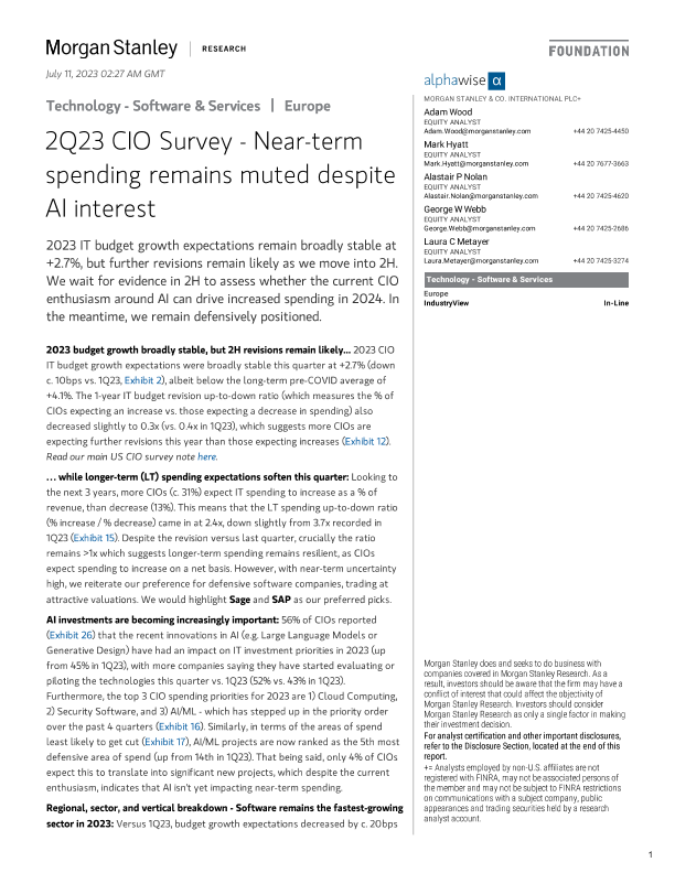 【Morgan Stanley】【20230711】Technology - Software & Services 2Q23 CIO Survey - Near-term spending remains muted despite AI interest-48页