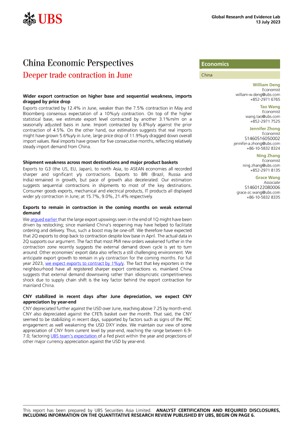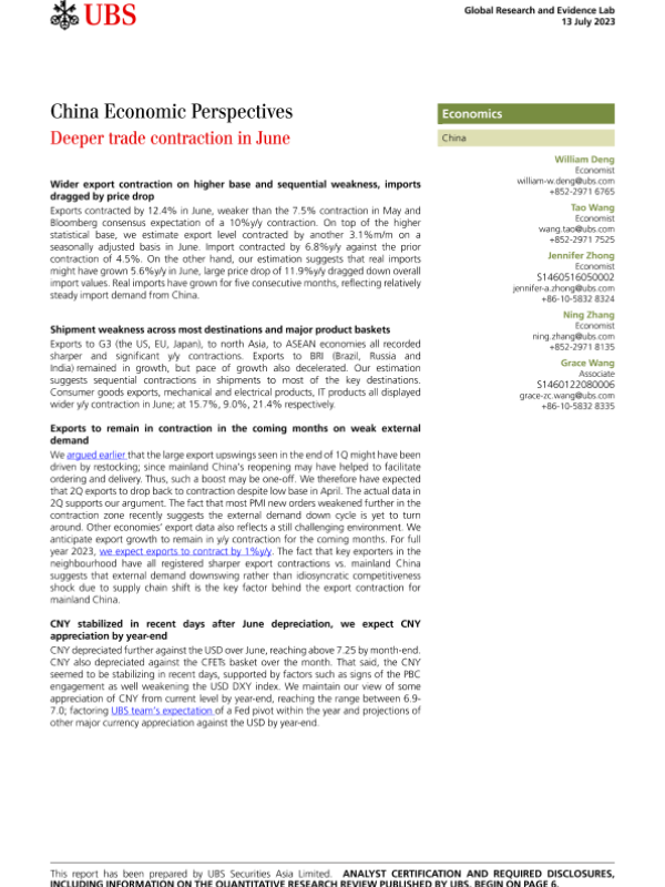 【UBS Securities Asia Limited】【20230713】中国经济发展展望:6月贸易进一步收缩-9页