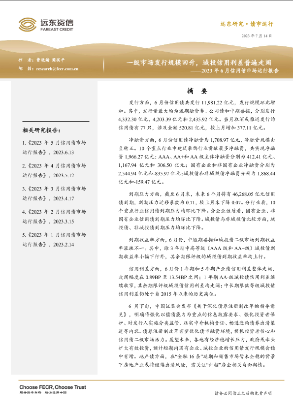 【远东资信】【20230714】2023年6月信用债市场运行报告:一级市场发行规模回升,城投信用利差普遍走阔-20页