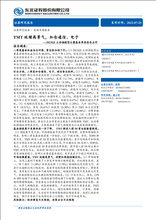 【东北证券】【20230725】2023Q2主动偏股型公募基金季度报告点评:TMT延续高景气,加仓通信、电子-22页