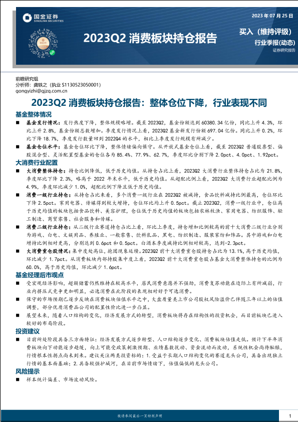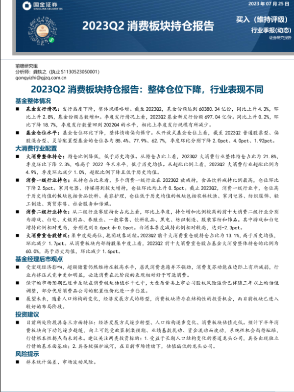【国金证券】【20230725】2023Q2消费板块持仓报告:整体仓位下降,行业表现不同-23页