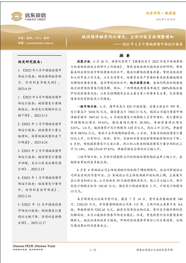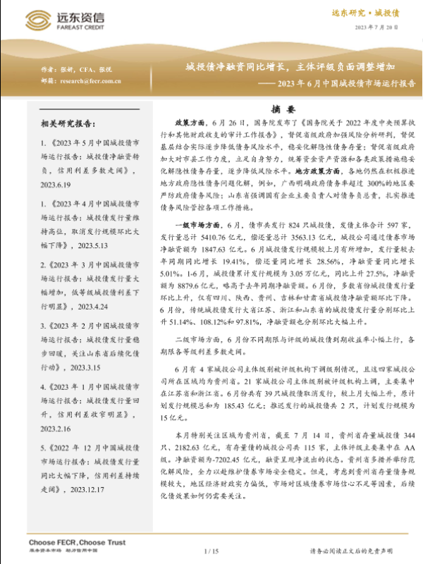 【远东证券】【20230720】2023年6月中国城投债市场运行报告:城投债净融资同比增长,主体评级负面调整增加-15页
