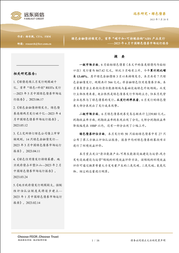 【远东咨询】【20230720】2023年6月中国绿色债券市场运行报告:绿色金融债持续发力,首单“碳中和+可持续挂钩”ABS产品发行-16页