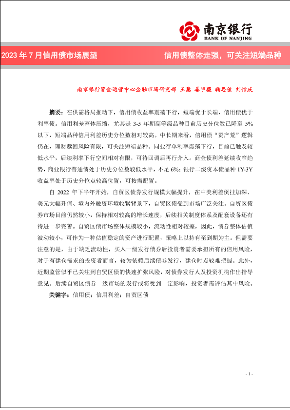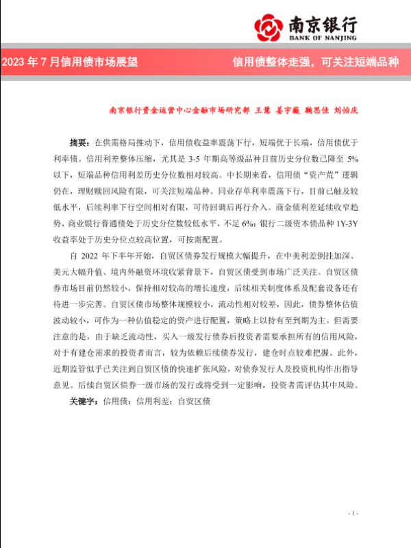 【南京银行】【20230724】2023年7月信用债市场展望:信用债整体走强,可关注短端品种-20页