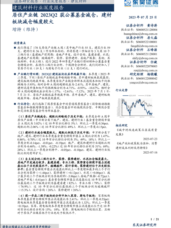 【东吴证券】【20230725】建筑材料行业深度报告-居住产业链2023Q2获公募基金减仓-建材板块减仓幅度较大-21页