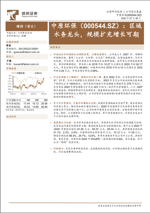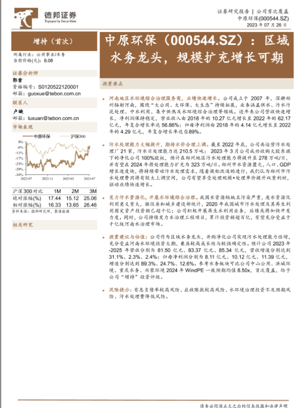 【德邦证券】【20230726】中原环保(000544)区域水务龙头,规模扩充增长可期-27页