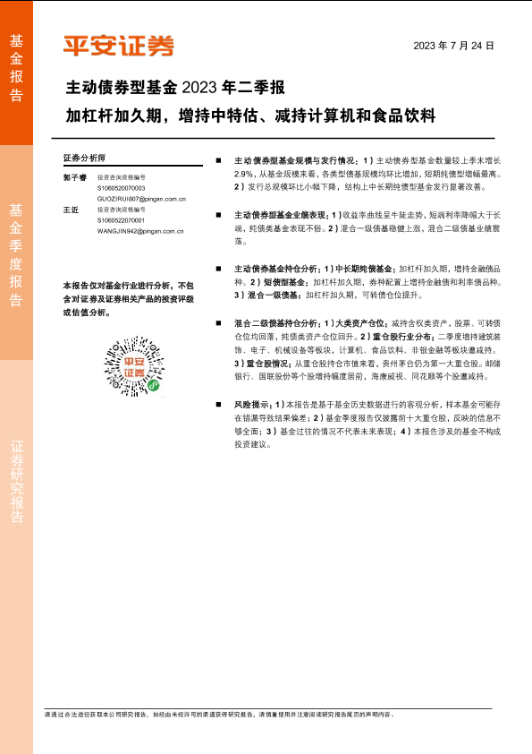 【平安证券】【20230724】主动债券型基金2023年二季报:加杠杆加久期,增持中特估、减持计算机和食品饮料-18页