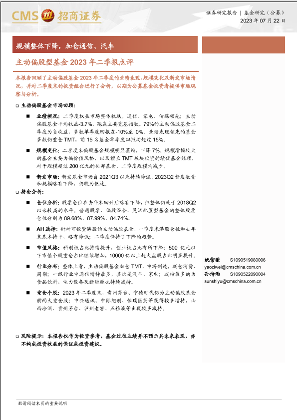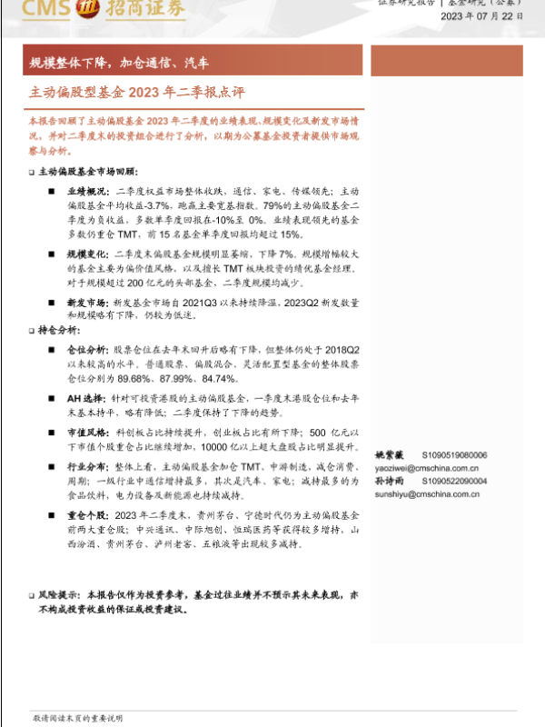 【海通证券】【20230722】主动偏股型基金2023年二季报点评:规模整体下降,加仓通信、汽车-17页