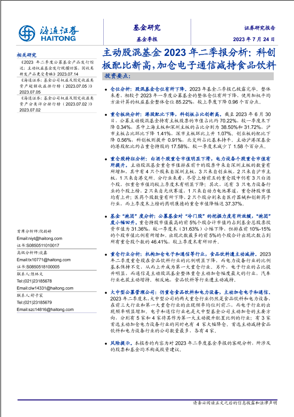 【海通证券】【20230724】主动股混基金2023年二季报分析:科创板配比新高,加仓电子通信减持食品饮料-16页
