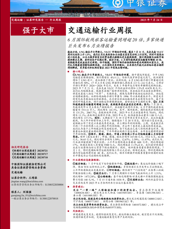 【中银证券】【20230724】交通运输行业周报:6月国际航线旅客运输量同增超20倍,多家快递巨头发布6月业绩报告-30页