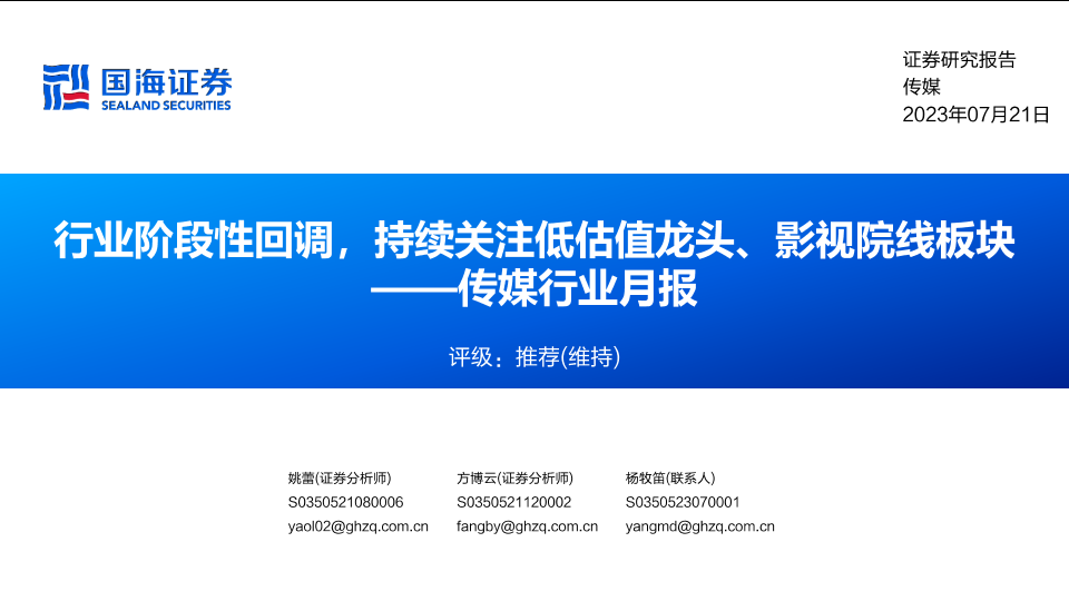 【国海证券】【20230721】传媒行业月报:行业阶段性回调,持续关注低估值龙头、影视院线板块-31页