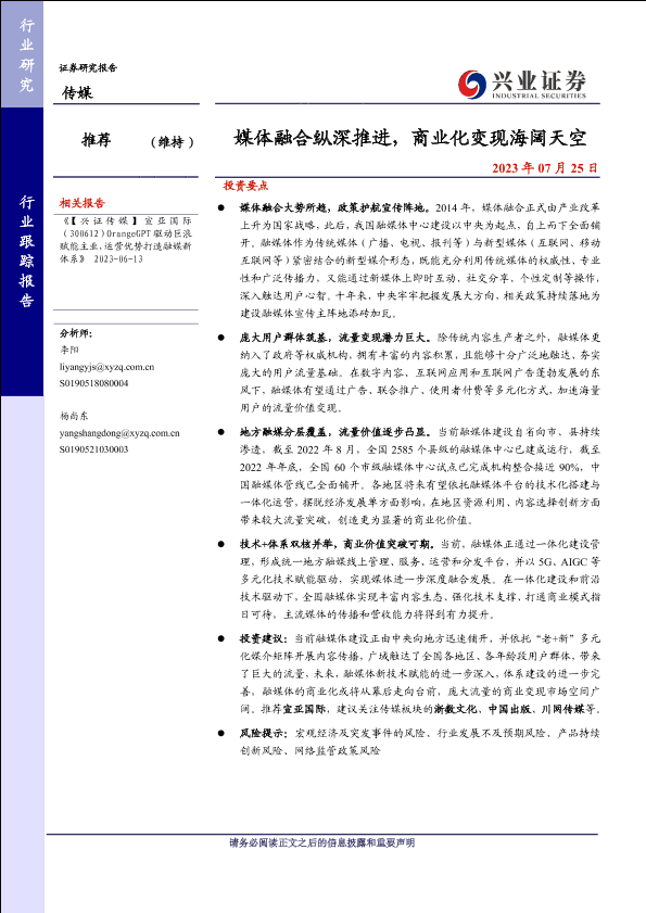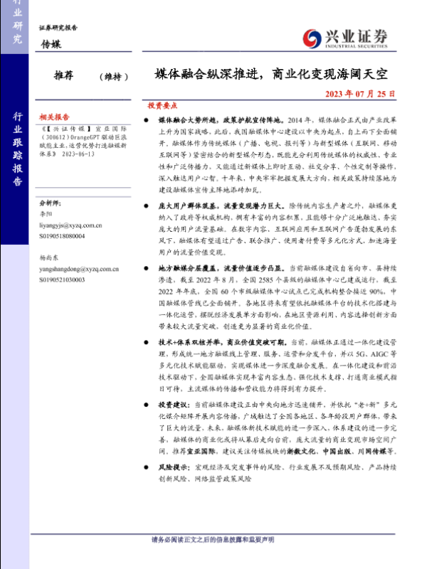 【兴业证券】【20230725】传媒行业跟踪报告:媒体融合纵深推进,商业化变现海阔天空-23页