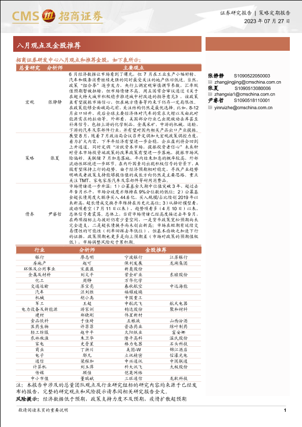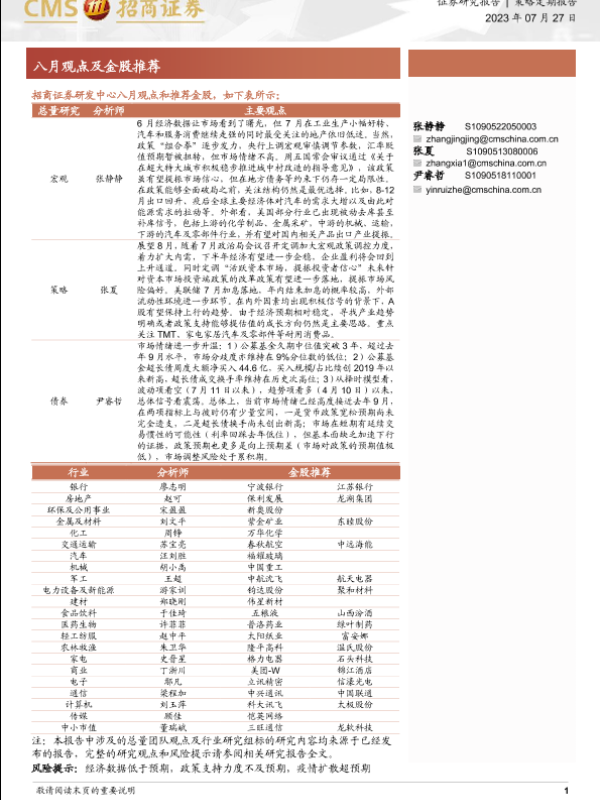 【海通证券】【20230727】八月观点及金股推荐-28页