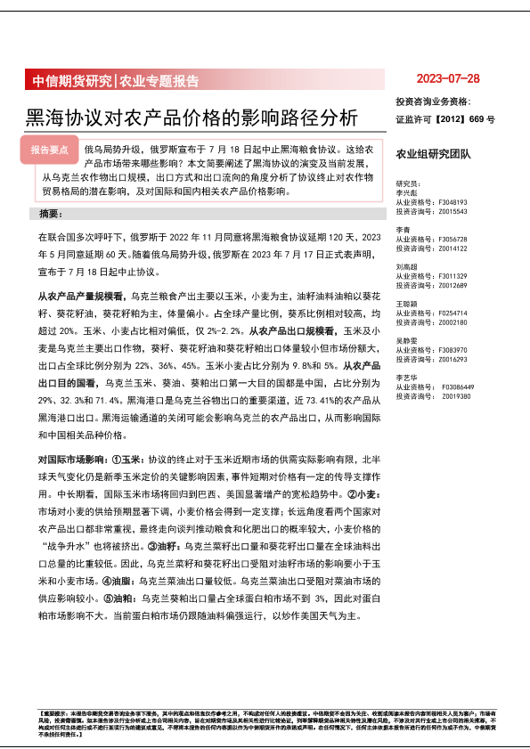 【中信期货】【20230728】农业专题报告:黑海协议对农产品价格的影响路径分析-26页