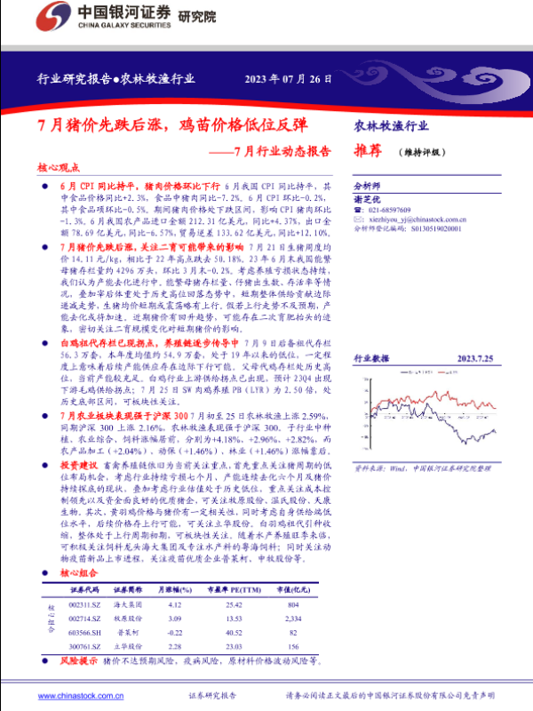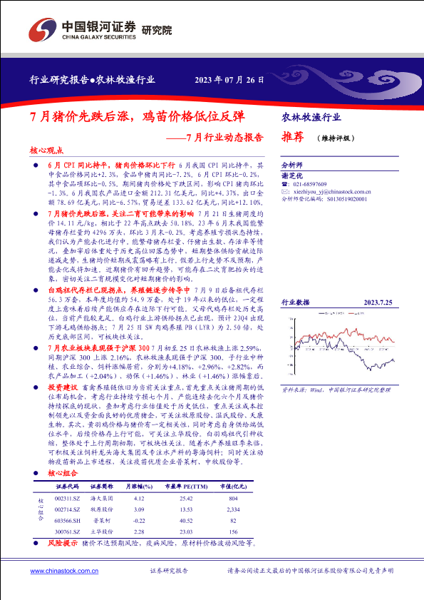【银河证券】【20230726】农林牧渔7月行业动态报告:7月猪价先跌后涨,鸡苗价格低位反弹-21页