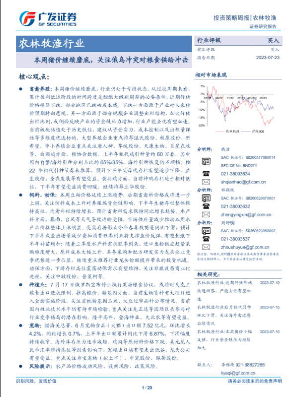 【广发证券】【20230723】农林牧渔行业投资策略周报:本周猪价继续磨底,关注俄乌冲突对粮食供给冲击-23页