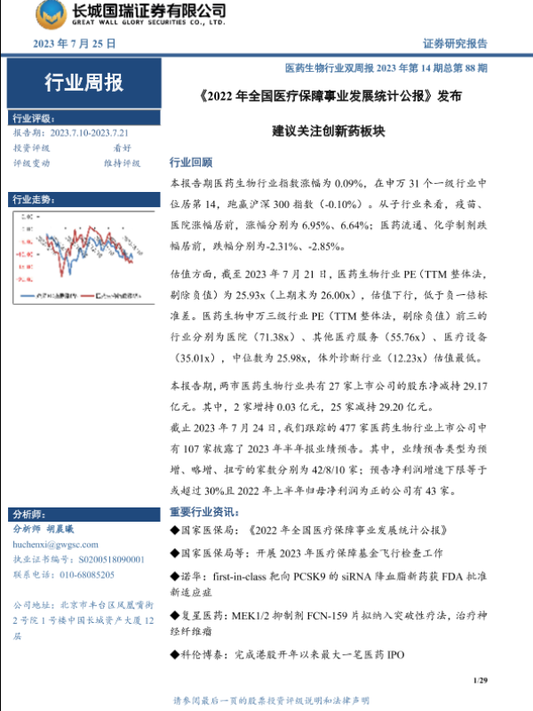 【长城国瑞证券】【20230725】药生物行业双周报2023年第14期总第88期:《2022年全国医疗保障事业发展统计公报》发布 建议关注创新药板块-29页