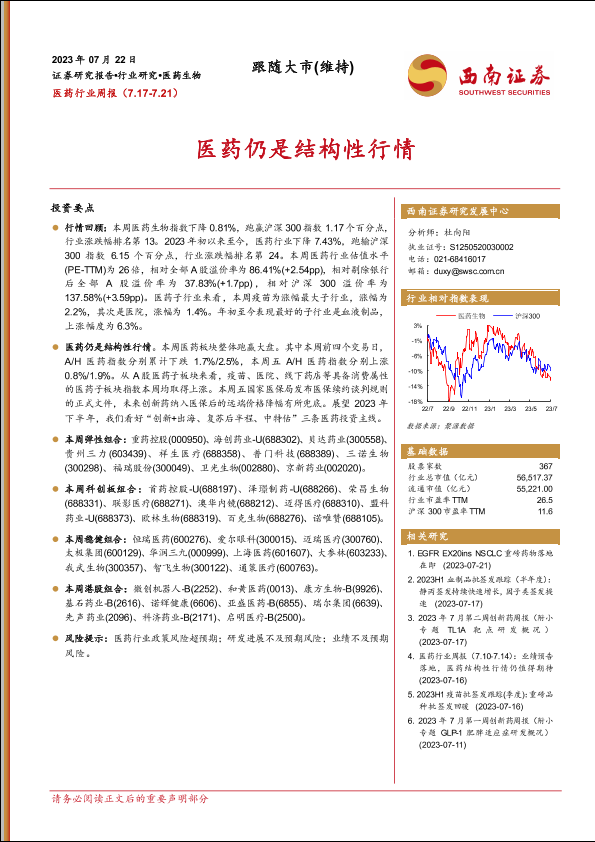 【西南证券】【20230722】医药行业周报:医药仍是结构性行情-34页