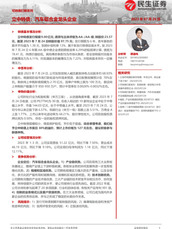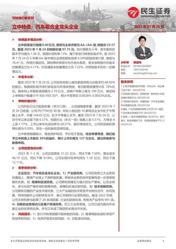 【民生证券】【20230726】可转债打新系列:立中转债,汽车铝合金龙头企业-15页