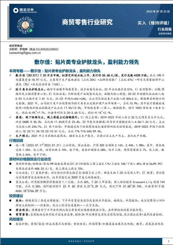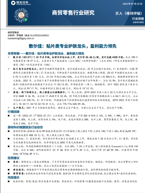 【国金证券】【20230723】商贸零售行业研究:敷尔佳:贴片类专业护肤龙头,盈利能力领先-29页