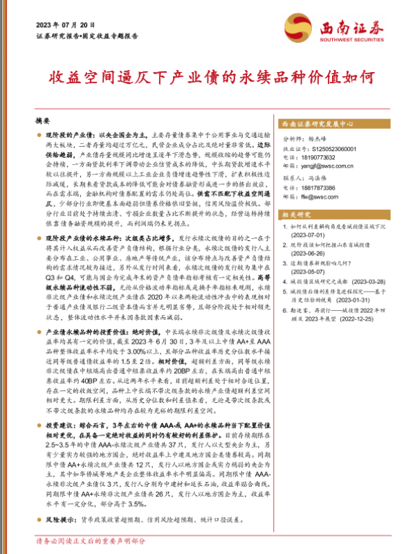 【西南证券】【20230720】收益空间逼仄下产业债的永续品种价值如何-25页