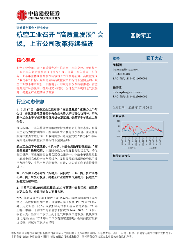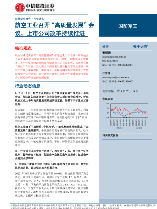 【中信建投证券】【20230724】国防军工行业动态:航空工业召开“高质量发展”会议,上市公司改革持续推进-25页