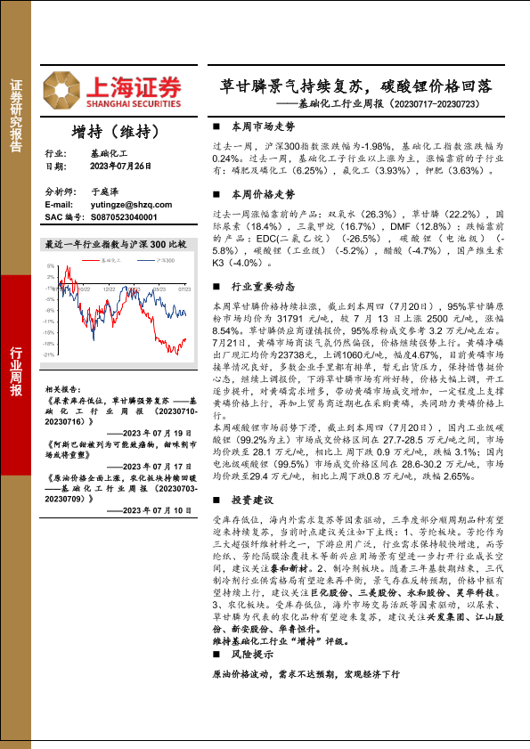【上海证券】【20230726】基础化工行业周报:草甘膦景气持续复苏,碳酸锂价格回落-16页