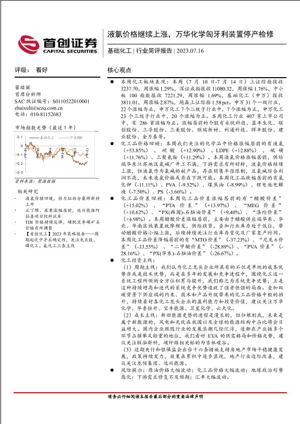 【首创证券】【20230716】基础化工行业简评报告:液氯价格继续上涨,万华化学匈牙利装置停产检修-18页