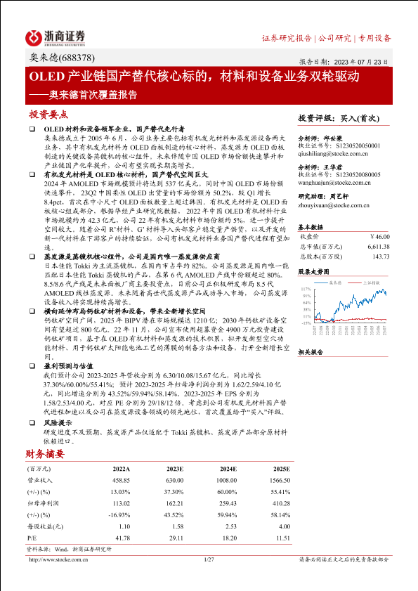 【浙商证券】【20200723】奥来德首次覆盖报告:OLED产业链国产替代核心标的,材料和设备业务双轮驱动-27页