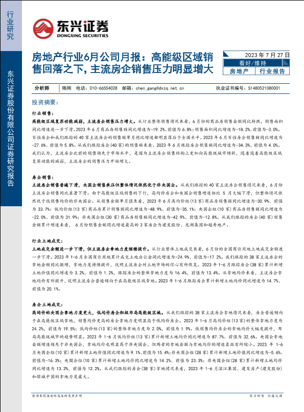 【东兴证券】【20230727】房地产行业6月公司月报:高能级区域销售回落之下,主流房企销售压力明显增大-60页