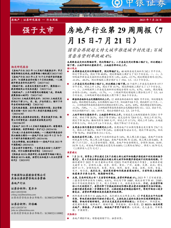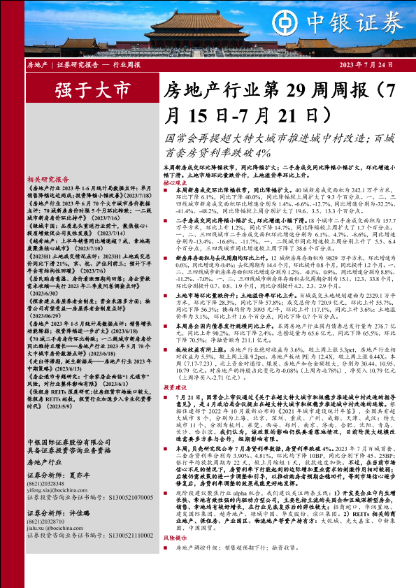 【中银证券】【20230724】房地产行业第29周周报:国常会再提超大特大城市推进城中村改造;百城首套房贷利率跌破4%-26页