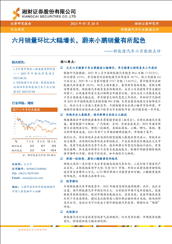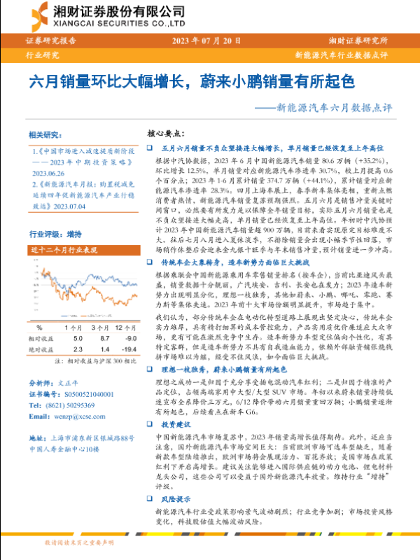 【湘财证券】【20230720】新能源汽车行业六月数据点评:六月销量环比大幅增长,蔚来小鹏销量有所起色-17页