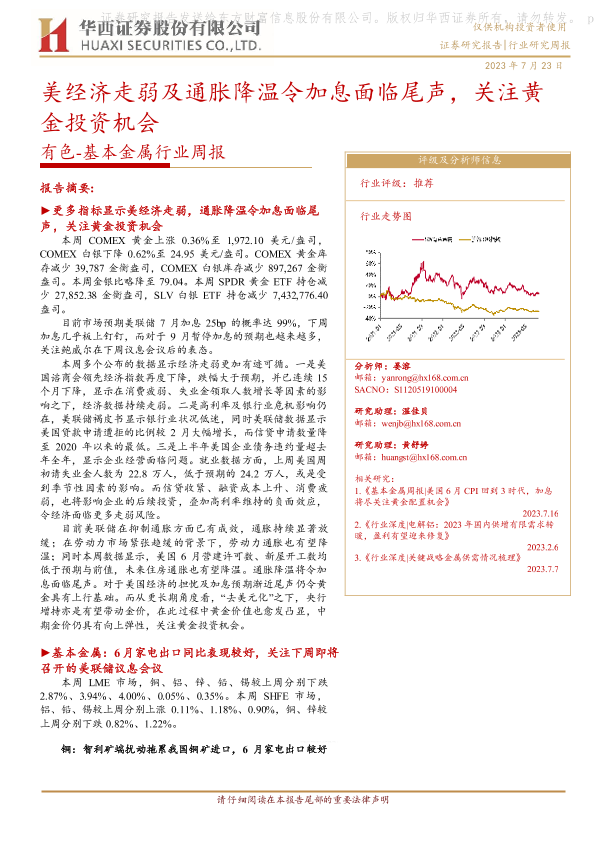 【华西证券】【20230723】有色-基本金属行业周报:美经济走弱及通胀降温令加息面临尾声,关注黄金投资机会-21页