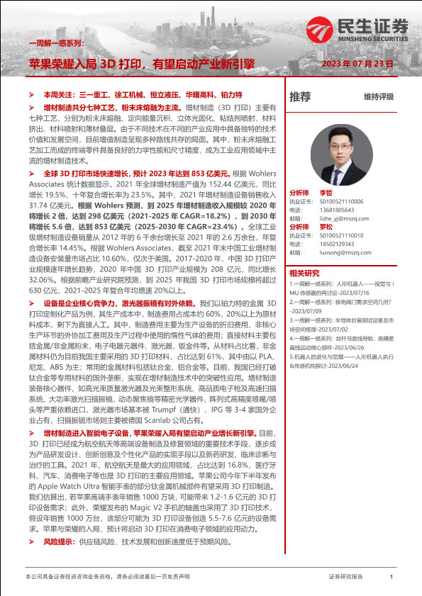 【民生证券】【20230723】机械一周解一惑系列:苹果荣耀入局3D打印,有望启动产业新引擎-24页