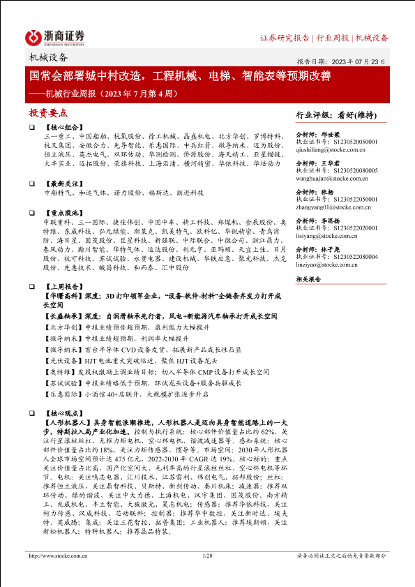 【浙商证券】【20230723】机械行业周报(2023年7月第4周):国常会部署城中村改造,工程机械、电梯、智能表等预期改善-28页