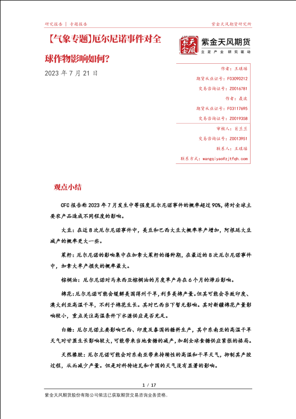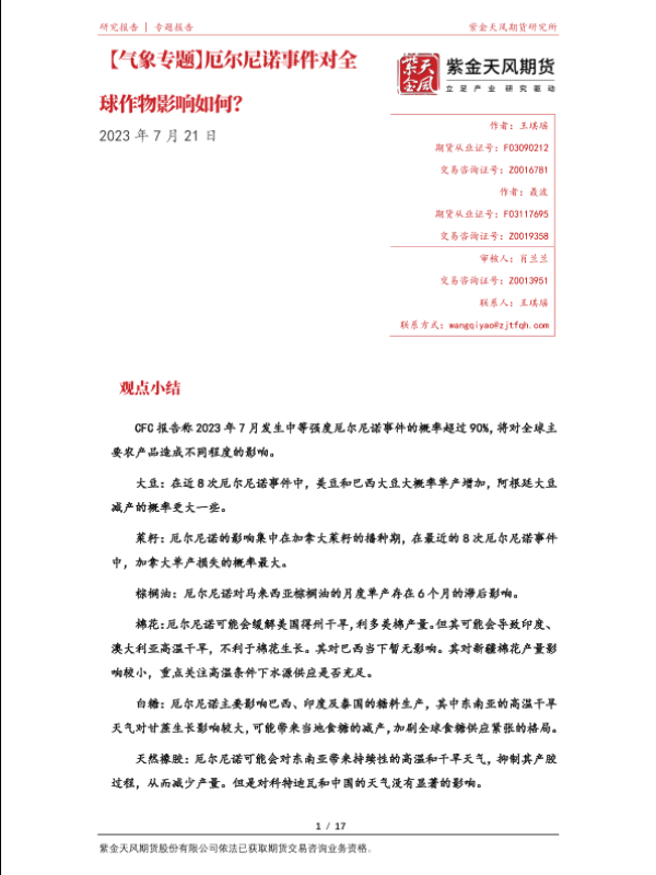 【紫金天风期货】【20230721】气象专题:厄尔尼诺事件对全球作物影响如何?-17页