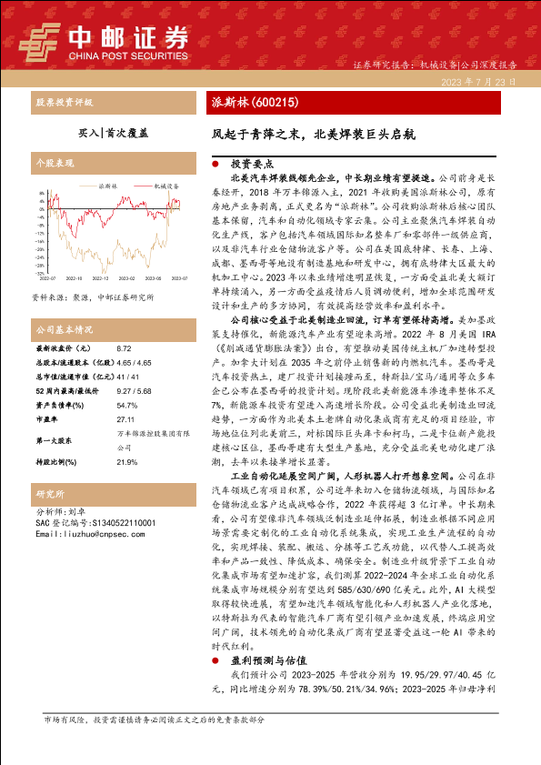 【中邮证券】【20230723】派斯林(600215)风起于青萍之末,北美焊装巨头启航-27页