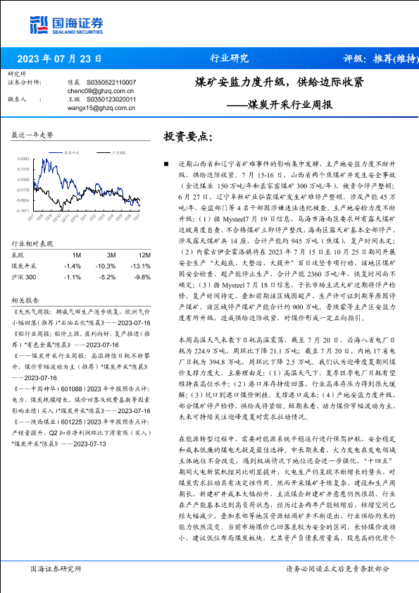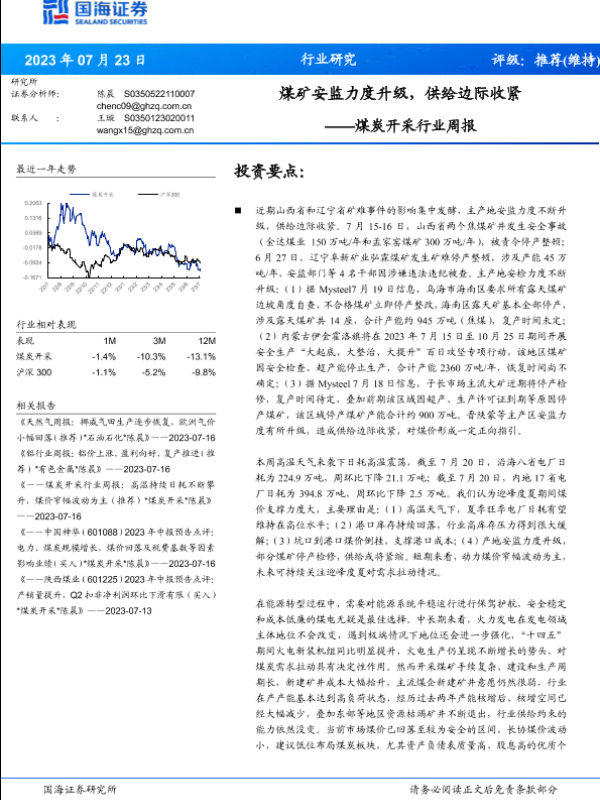 【国海证券】【20230723】煤炭开采行业周报:煤矿安监力度升级,供给边际收紧-22页