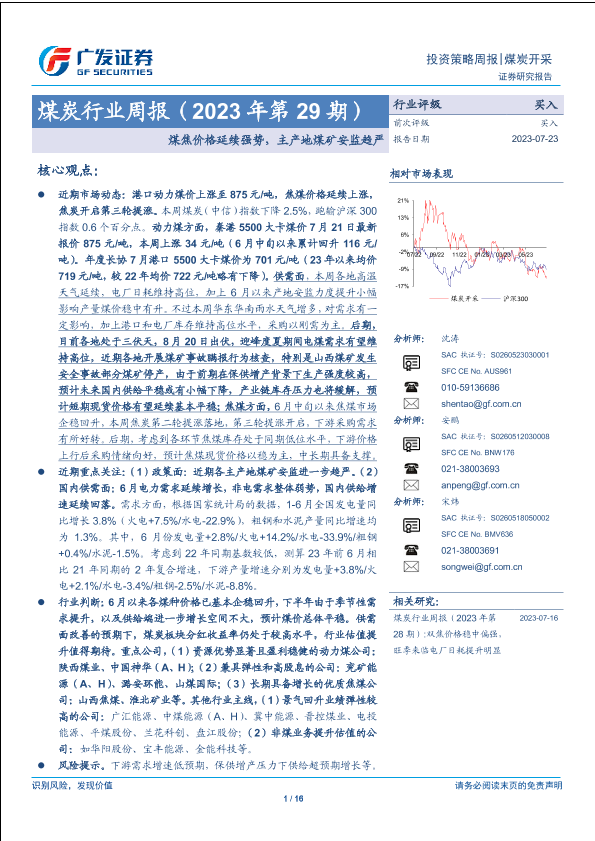 【广发证券】【20230723】煤炭行业周报(2023年第29期):煤焦价格延续强势,主产地煤矿安监趋严-16页