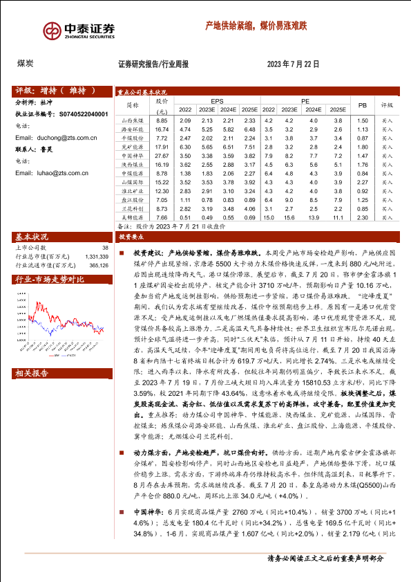 【中泰证券】【20230722】煤炭行业周报:产地供给紧缩,煤价易涨难跌-25页