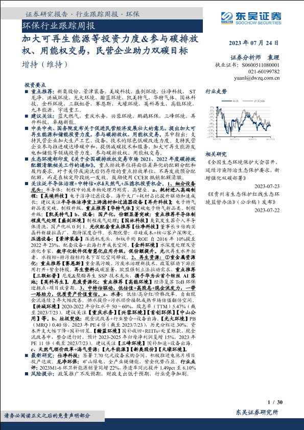 【东吴证券】【20230724】环保行业跟踪周报:加大可再生能源等投资力度&参与碳排放权、用能权交易,民营企业助力双碳目标-30页