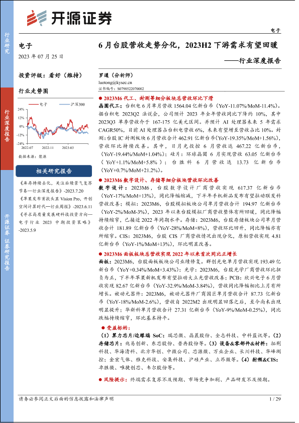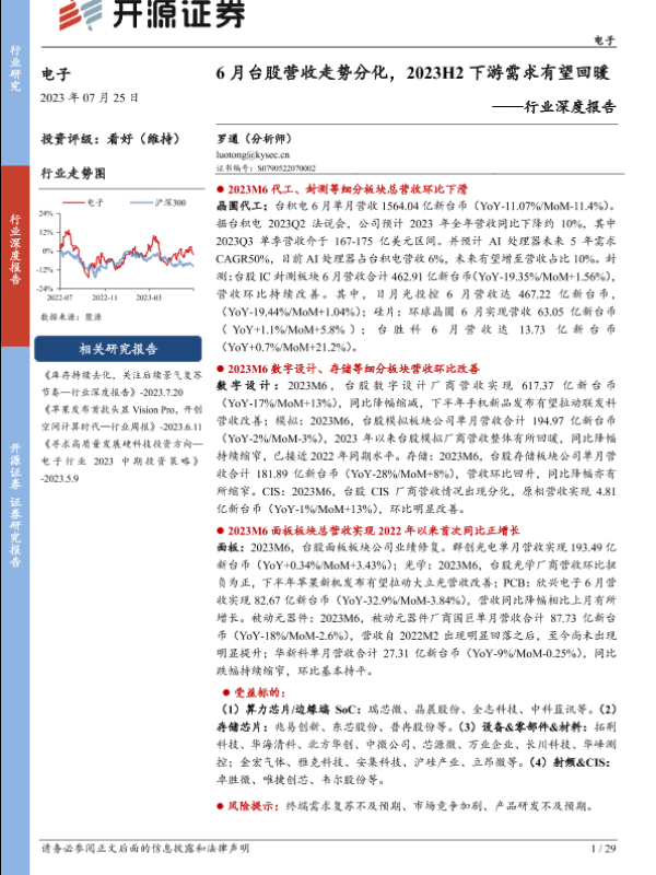 【开源证券】【20230725】电子行业深度报告:6月台股营收走势分化,2023H2下游需求有望回暖-29页