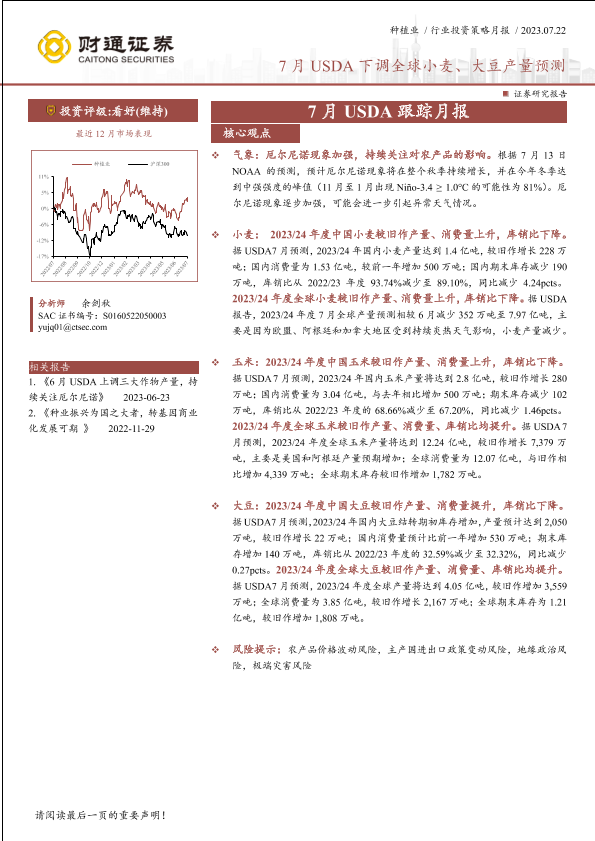 【财通证券】【20230722】种植业行业7月USDA跟踪月报:7月USDA下调全球小麦、大豆产量预测-18页