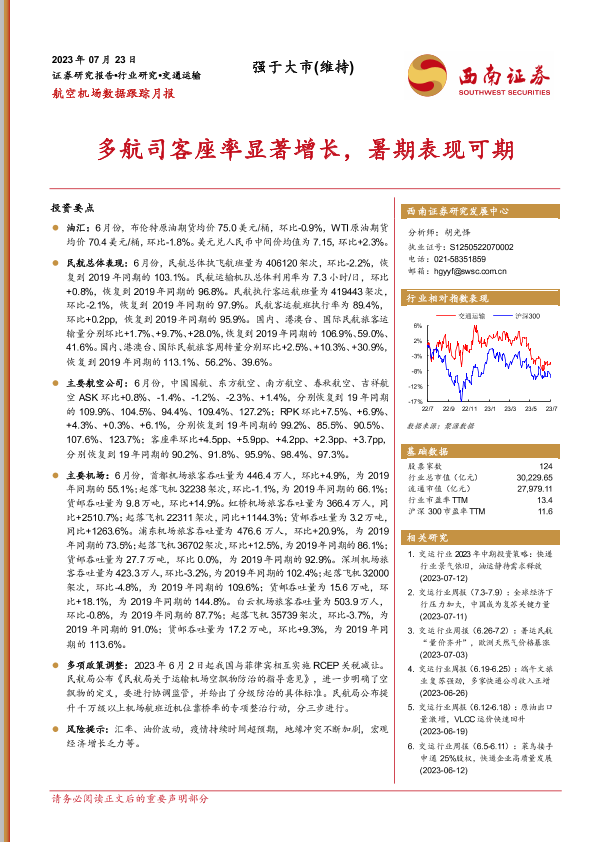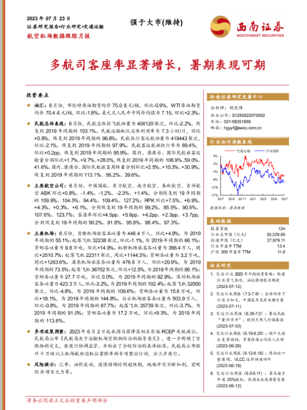 【西南证券】【20230723】航空机场行业数据跟踪月报:多航司客座率显著增长,暑期表现可期-18页