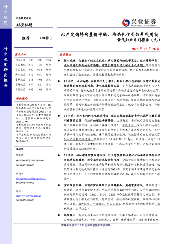 市场策略 景气周期 行业分析 量价平衡 航空机场