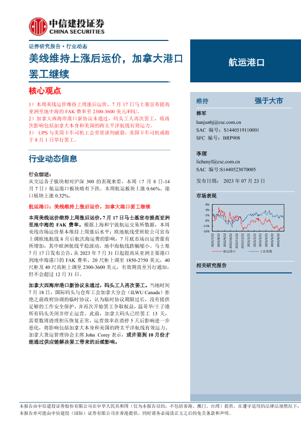 【中信建投证券】【20230723】航运港口行业:美线维持上涨后运价,加拿大港口罢工继续-26页