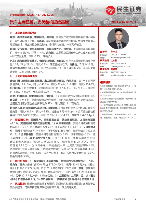 【民生证券】【20230725】行业信息跟踪:汽车去库显著,光伏装机延续高增-30页
