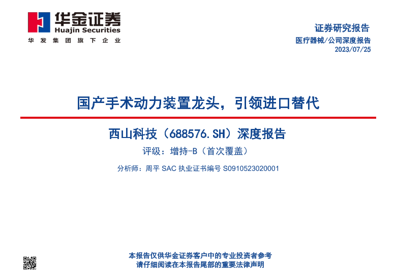 【华金证券】【20230725】西山科技深度报告:国产手术动力装置龙头,引领进口替代-55页